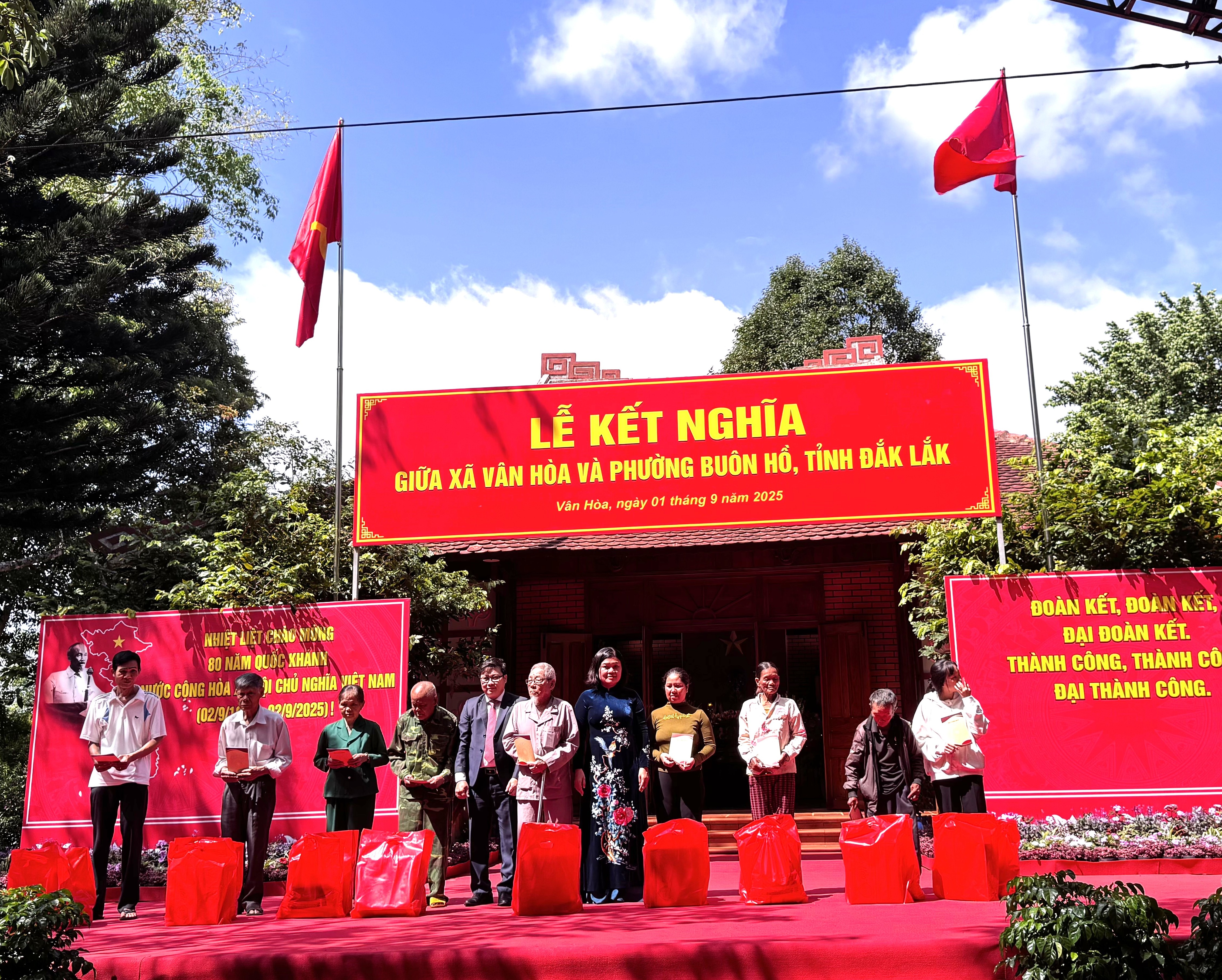Sáng 1/9, nhân kỷ niệm 80 năm Quốc khánh (02/9/1945 - 02/9/2025), tại Nhà thờ Bác Hồ (xã Vân Hòa), Đảng ủy xã Vân Hòa và Đảng ủy phường Buôn Hồ long trọng tổ chức Lễ kết nghĩa. Tham dự buổi lễ có các đồng chí: Đinh Thị Thu Thanh, Ủy viên Ban Thường vụ Tỉnh ủy, Trưởng Ban Tuyên giáo và Dân vận Tỉnh ủy; Đào Bảo Minh, Ủy viên Ban Thường vụ Tỉnh ủy, Bí thư Đảng ủy, Chủ tịch HĐND phường Tuy Hòa; H’Yim Kđoh, Ủy viên Ban Thường vụ Tỉnh ủy, Bí thư Đảng ủy, Chủ tịch HĐND phường Buôn Hồ; Lê Văn Quy, Bí thư Đảng ủy, Chủ tịch HĐND xã Vân Hòa; lãnh đạo HĐND tỉnh, Ban Nội chính Tỉnh ủy; các đồng chí Tỉnh ủy viên phụ trách Đảng bộ xã Vân Hòa; lãnh đạo các cơ quan, đơn vị của tỉnh và hai địa phương, cùng đại diện đông đảo các tầng lớp Nhân dân.